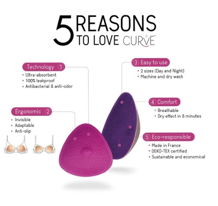 With a complete absorption and absolute comfort all day long, Curve nursing pads dry very quickly, up to 8 minutes against skin contact.
