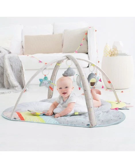 Every cloud has a silver lining and this dreamy baby activity gym is no exception! Offering hours of plush playtime, it features a soft color palette to complement modern decor along with pops of bright colors to stimulate baby’s sight. Five celestial-themed hanging toys will engage baby with lights, music and other stimuli while the cushy mat offers ultimate, cloud-like comfort. When it comes to baby’s enjoyment, the sky’s the limit!
