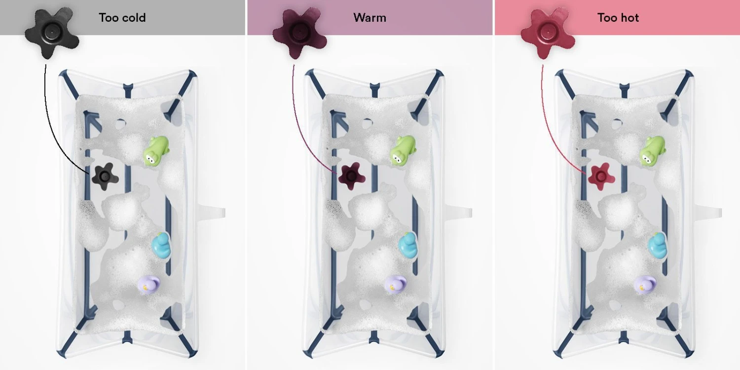 Stokke® Flexi Bath® is a foldable baby bath suitable from birth to four years. The space saving design makes it easy to store and convenient to use at home or when traveling, encouraging more shared bath time moments. The optional Stokke® Flexi Bath® Newborn Support provides additional comfort for newborn babies. Because Stokke are always striving to improve products, they´re offering a heat sensitive drain plug.The plug works by turning colors, when the water gets warm giving parents a visual cue, letting them know that the water temperature is getting needs to be checked. Please note that the plug is not a thermometer. Always double-check the water temperature with your hand to ensure that it is the right temperature for your baby´s comfort and safety. If you are in any doubt, use a reliable thermometer for accuracy.